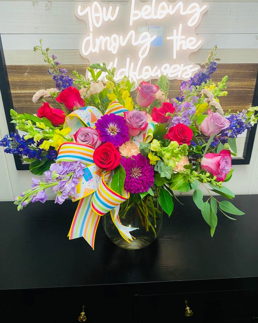 A beautiful way to say happy birthday. Fresh blooms, thoughtful design, festive birthday ribbon and a touch of celebration. Because birthdays deserve more than candles-they deserve blooms that last in memory.