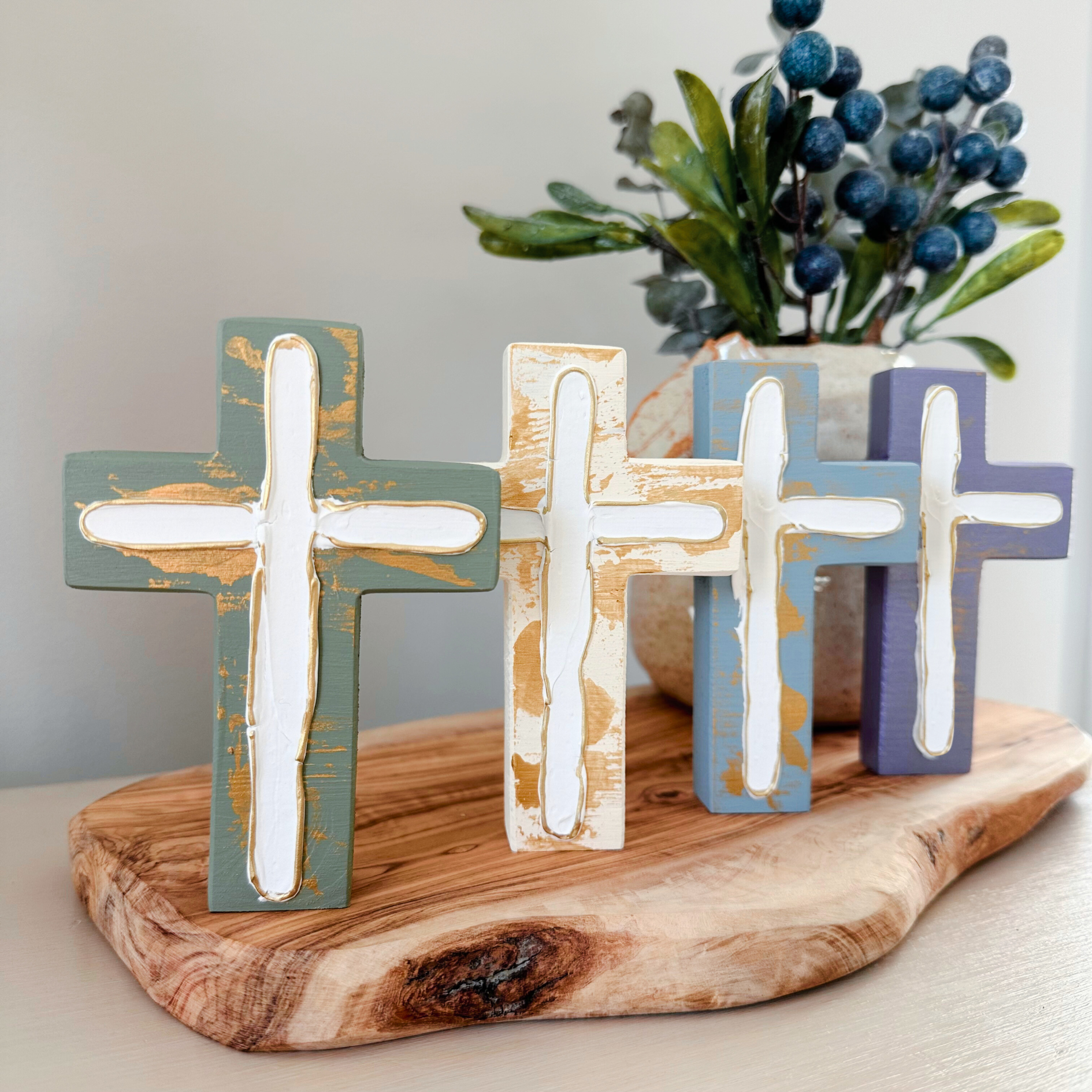 5" H x 3.5" W x 0.75" D cross. Hand-painted by Sara Miller. Textured detail outlined in Metallic Gold. Mini Rustic Wooden Cross