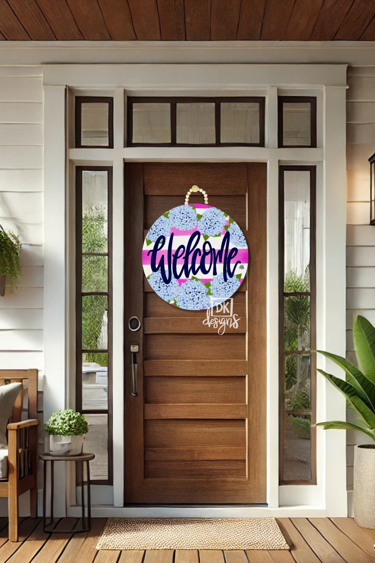 Hydrangea "Welcome" Large Hanger is a UV Printed Door hanger measuring 23" round that is perfect for indoor or outdoor use. All original designs are printed on a moisture resistant high quality 1/4" board and sealed for additional protection with 2 coats of a gloss finish. DK hangers come with a fully wired beaded handle.