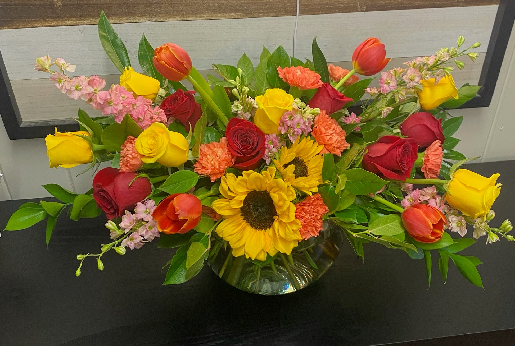 For custom colors and flowers, please contact us. This will be a designer's choice of seasonal, in-stock flowers