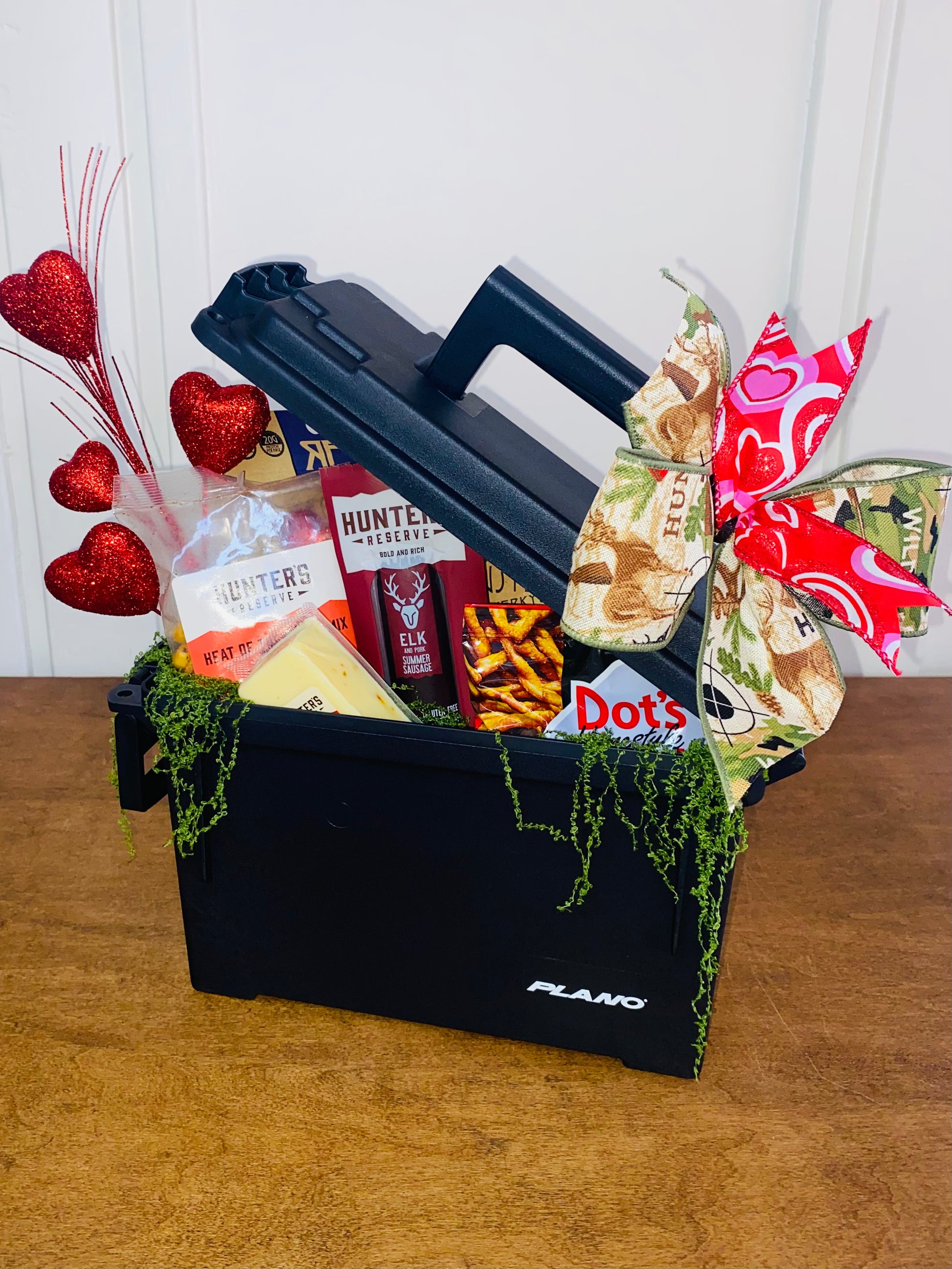 Cupid took his shot—and nailed it. A rugged ammo can loaded with savory treats made for him.