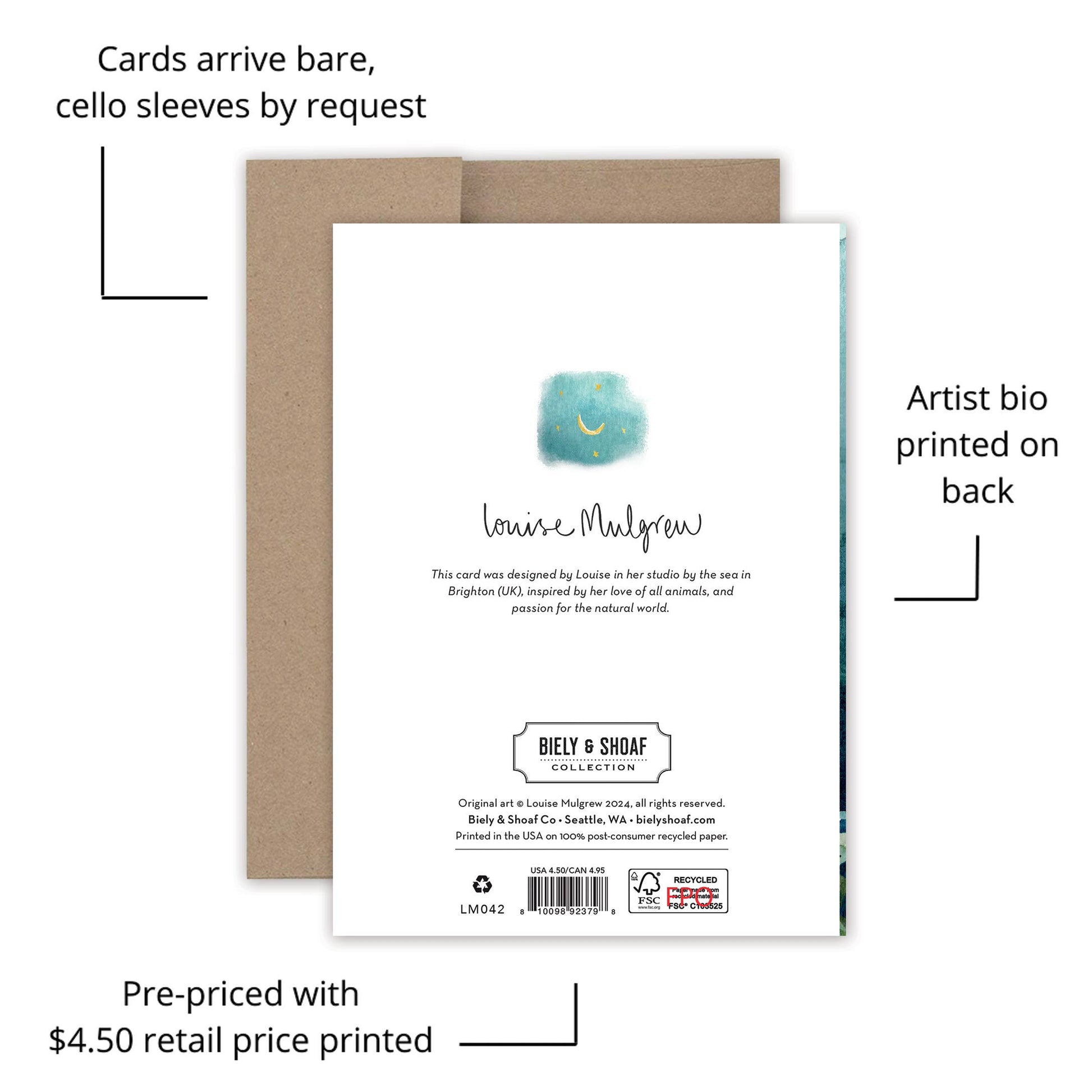 Inside verse: Happy Birthday • Size: A6, 4.6" x 6.4" • Illustrated by Louise Mulgrew • Treatment: Gold Foil • Envelope color: Brown Kraft • Printed in the USA on 100% post-consumer recycled paper
