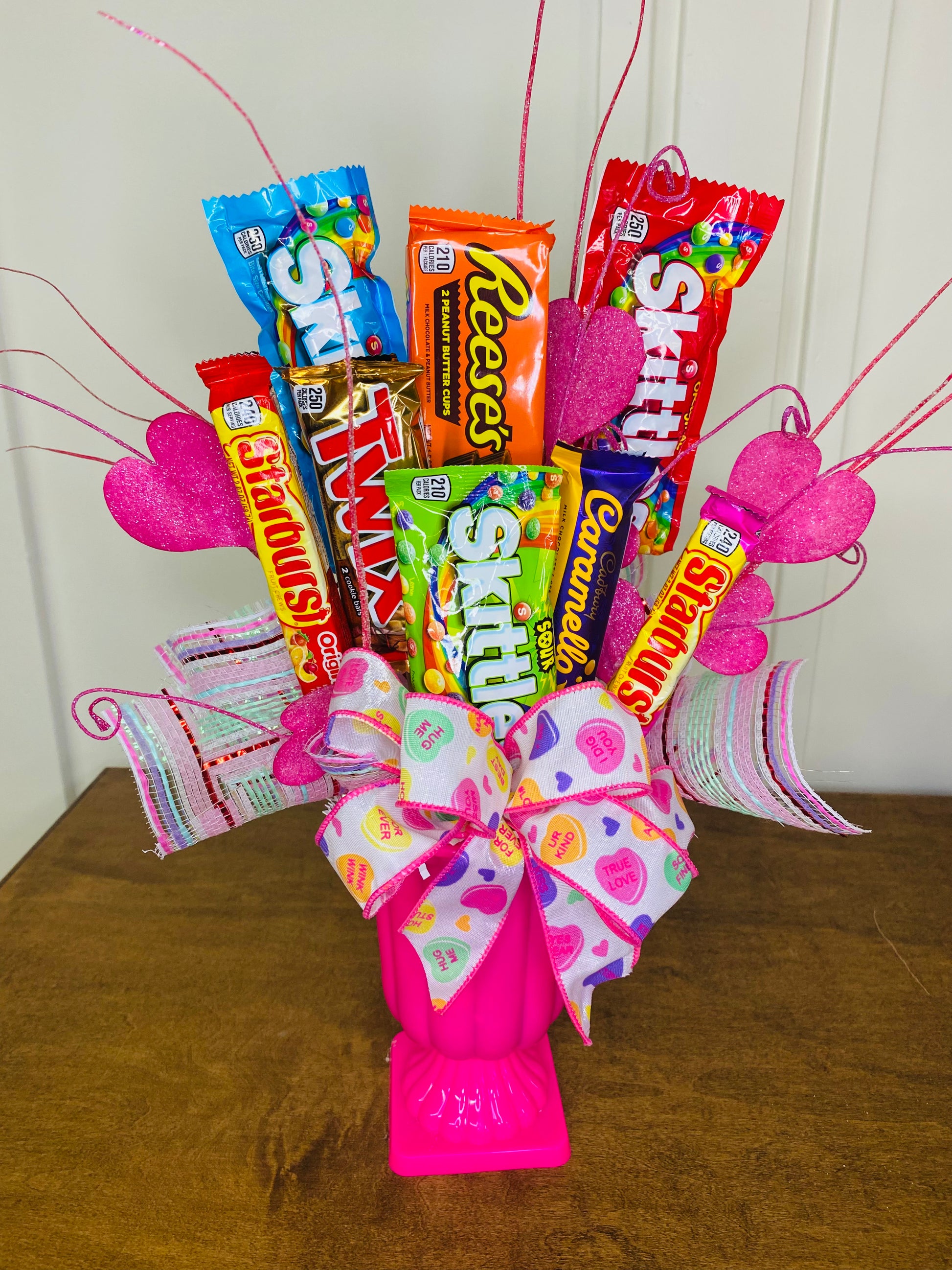 Where regal charm meets irresistible treats, this candy arrangement is pure Valentine delight