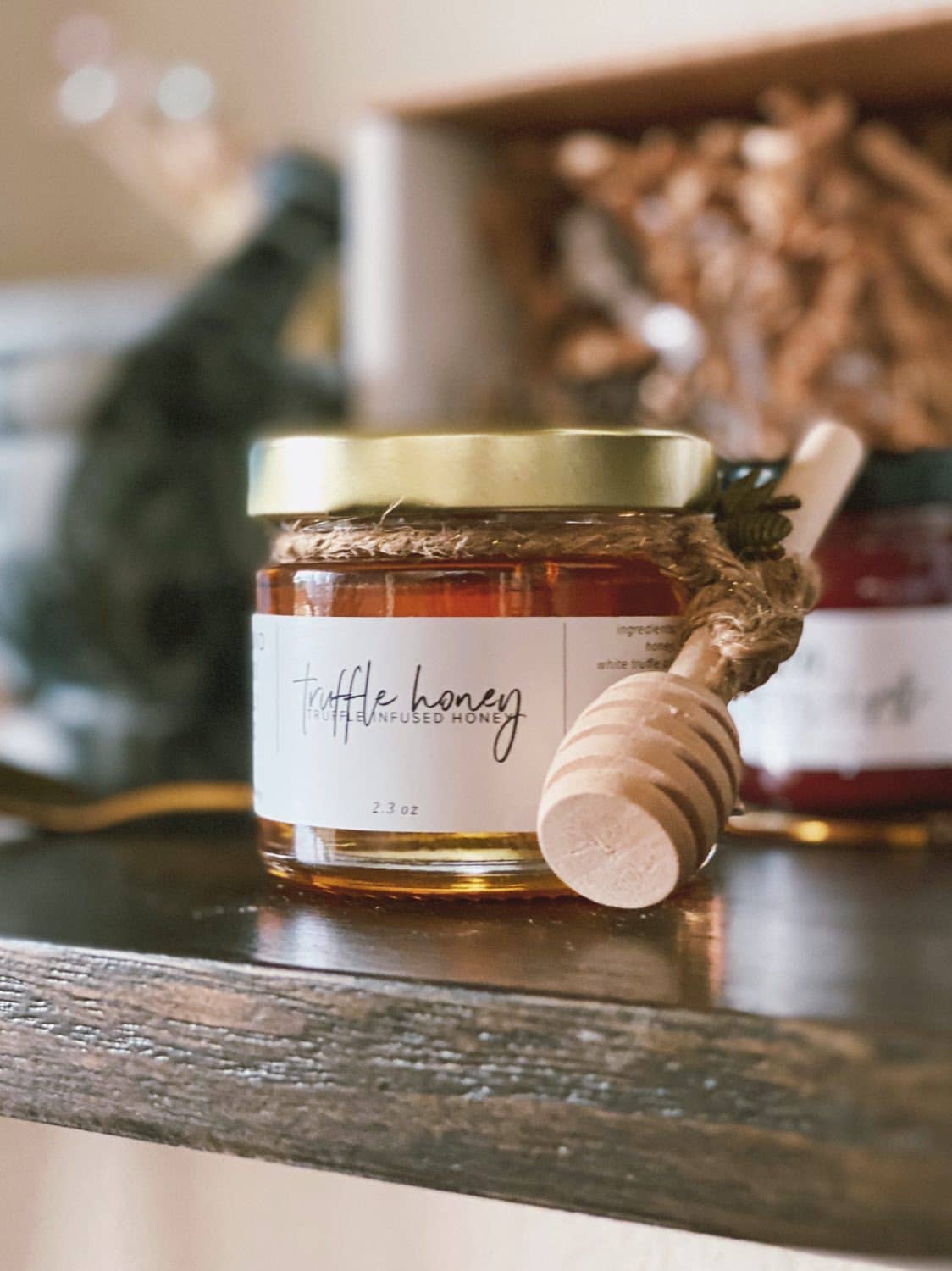 This well-balanced infused truffle honey is ideal for cheeseboards, salads and aged cheeses, fresh pasta, french fries, eggs and risotto. Size: 2.3 oz We use clover and wildflower honey DO NOT FEED HONEY TO INFANTS UNDER 1 YEAR OF AGE Honey may crystalize naturally in the jar *HONEY DIPPER NOT INCLUDED*